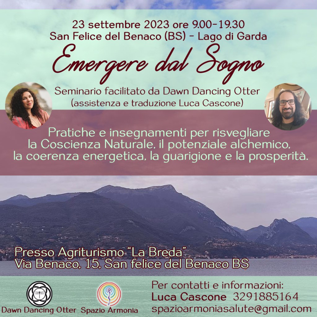 I seminari – “Emergere dal Sogno” e “Celebrare la Vita in Abbondanza” – si svolgono in luoghi separati, uno1 sul Lago di Garda (Agriturismo La Breda) e l’altro sul Golfo di Gaeta (SAHA Yoga Formia), in due meravigliose cornici naturali. Entrambi gli eventi durano dalle 9.00 alle 19.30 del sabato di riferimento.